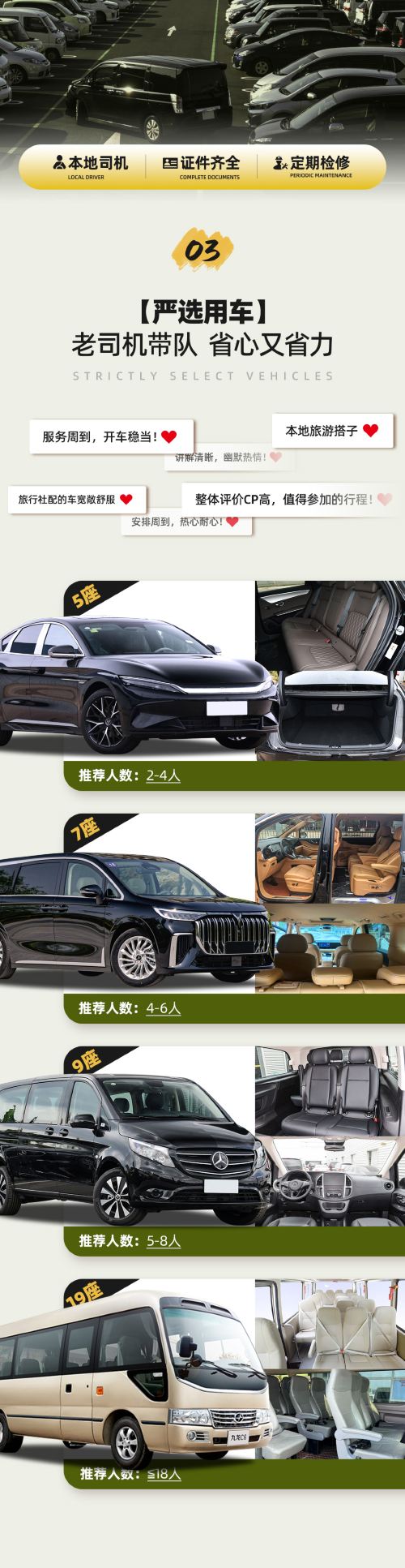 2、本产品按实际人数安排合适车型,并根据先到先上车原则,不预留位置,不接受指定座位,在不影响您行程的情况下,可能会南靖土楼和永定土楼共用车辆,交通过程中需要更换车辆,敬请谅解~