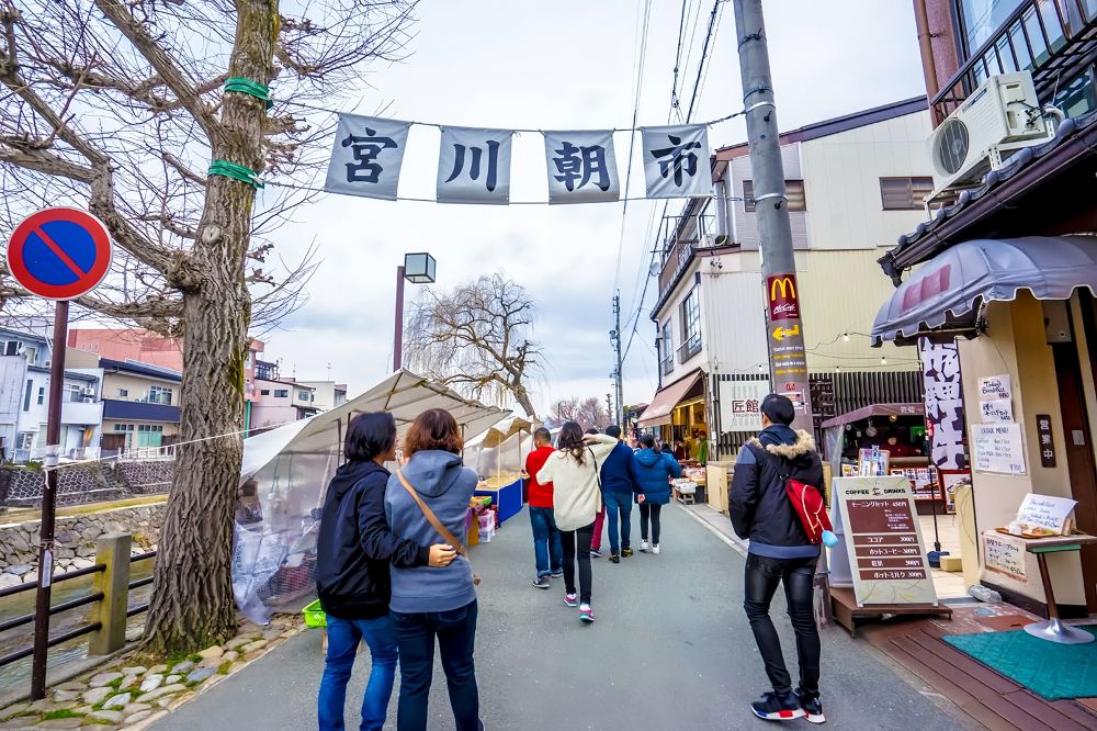 ▲ 宫川早市是日本著名的早市之一,已有约300年的历史。早市沿宫川河岸开设,您可以在这里找到当地新鲜采摘的蔬菜水果、传统渍物、手工工艺品及特色小吃,体验高山当地早晨充满活力的生活氛围。【堵车严重时,抵达可能已经散市,请一定知悉!】
