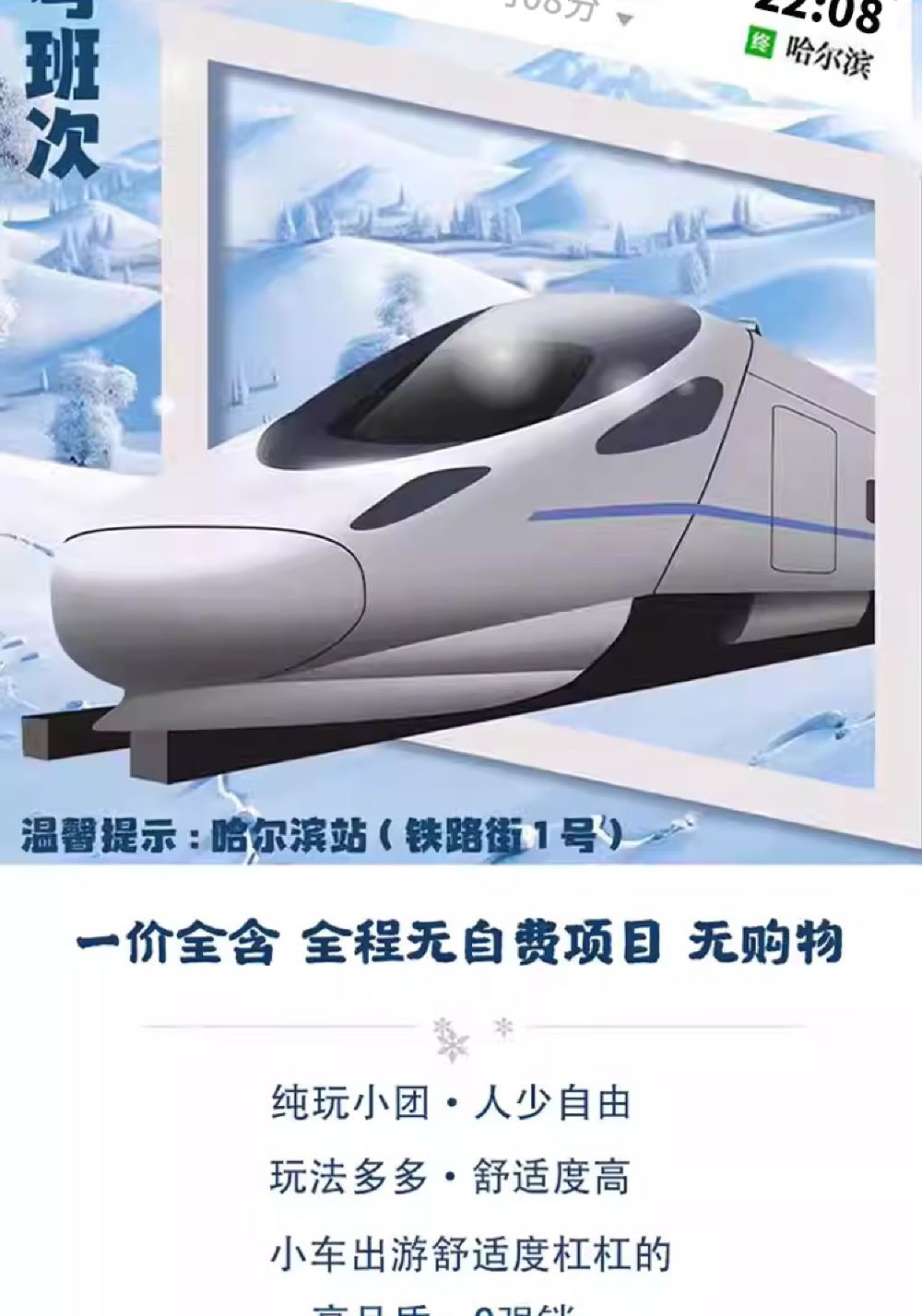 回程购买班次D7986次动车 亚布力西站发车时间21:00 到达哈尔滨站22:08分