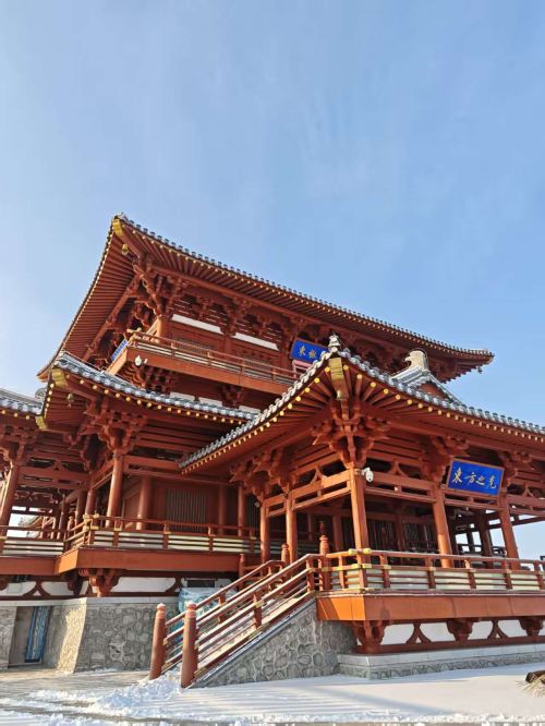 ▲ 想要真正理解"两江交汇"的壮阔,一定要登上南山公园山顶的东极阁。这座仿唐纯木结构建筑采用传统榫卯工艺,飞檐下铜铃随风轻响。爬上台城基座,黑龙江与乌苏里江交汇形成的"金三角"尽收眼底,晴天时甚至能望见俄罗斯哈巴罗夫斯克的城市轮廓。