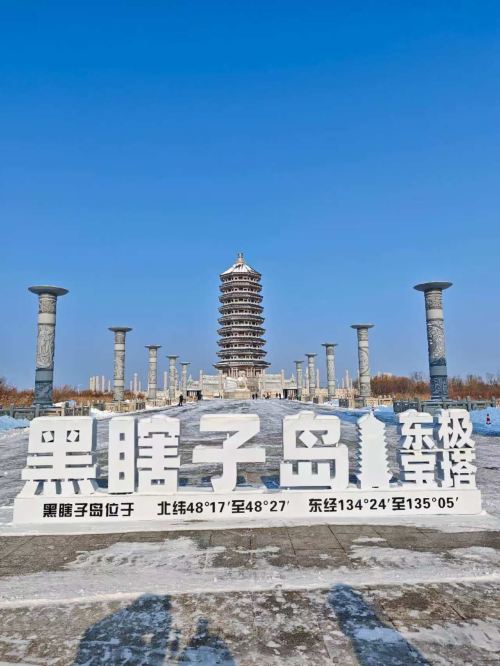 ▲ 这座宝塔处处是文化密码。塔高81米,取"九九归一"之意;中心塔相对地平高度79米,寓意黑瞎子岛79年后回归祖国;九层塔身代表高等级。仔细寻找广场两极点的龟和麒麟雕塑,这是传统中"水火既济、阴阳平衡"的象征。