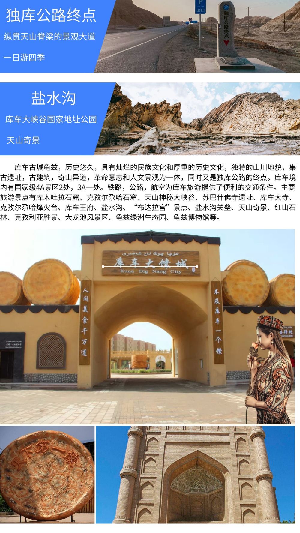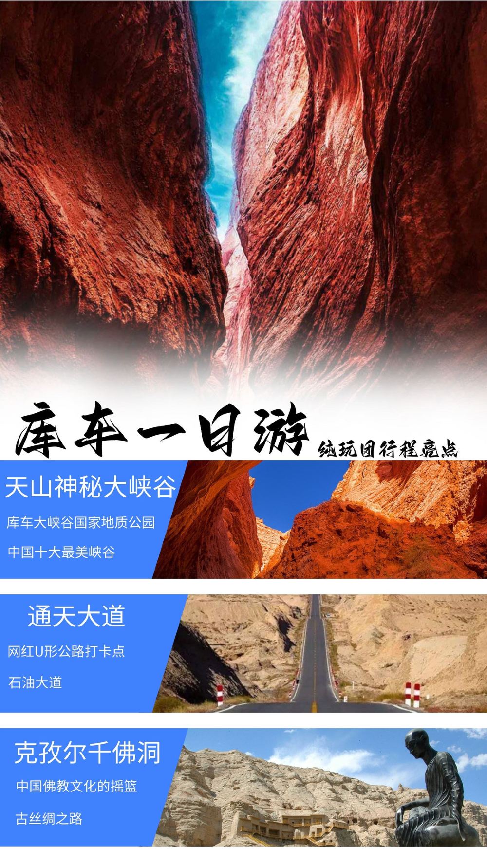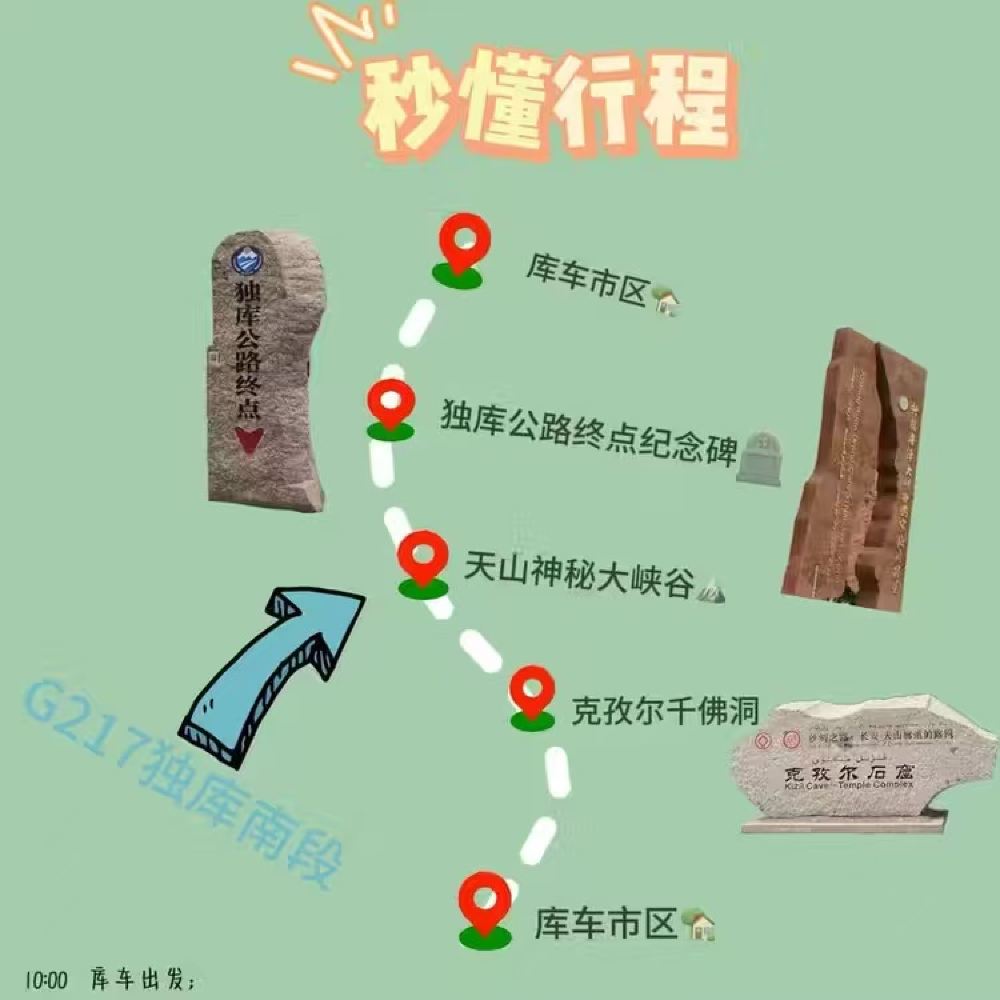 特别提示:克孜尔石窟参观需要提前预约(出发当天预约就可以),独库公路南段70公里左右,库车至天山神秘大峡谷那一段,每一年四季都开着,正常发团,天天发团!