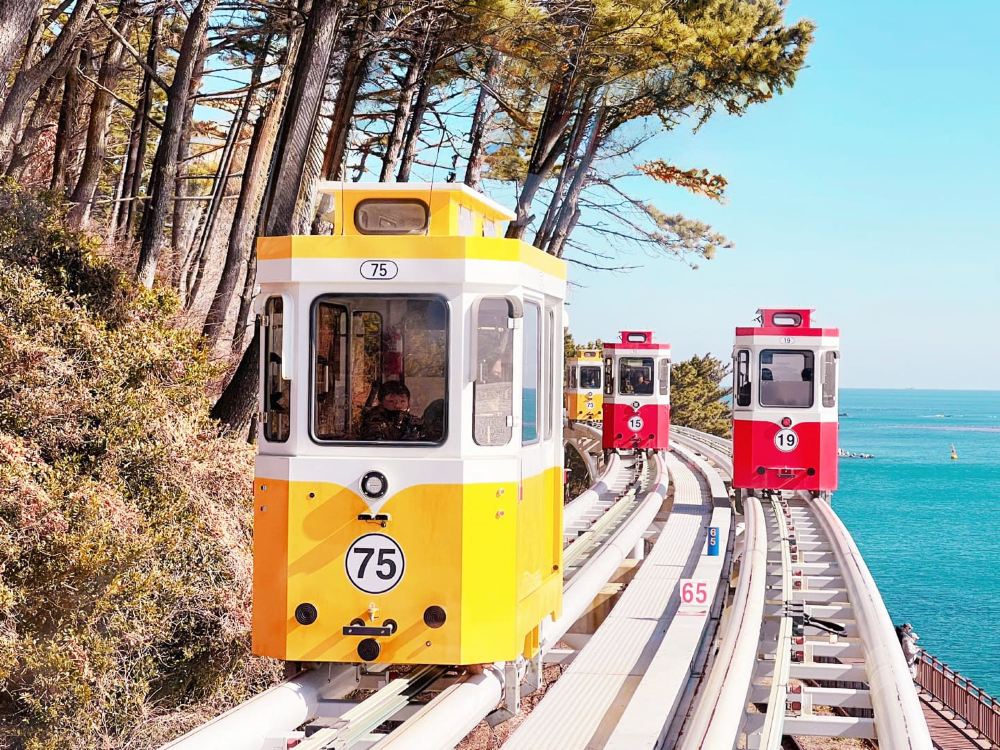 ▲ 3)蓝线公园天空胶囊: 热门的打卡景点! 搭乘天空胶囊, 拍下色彩缤纷的小列车与釜山海岸美景。