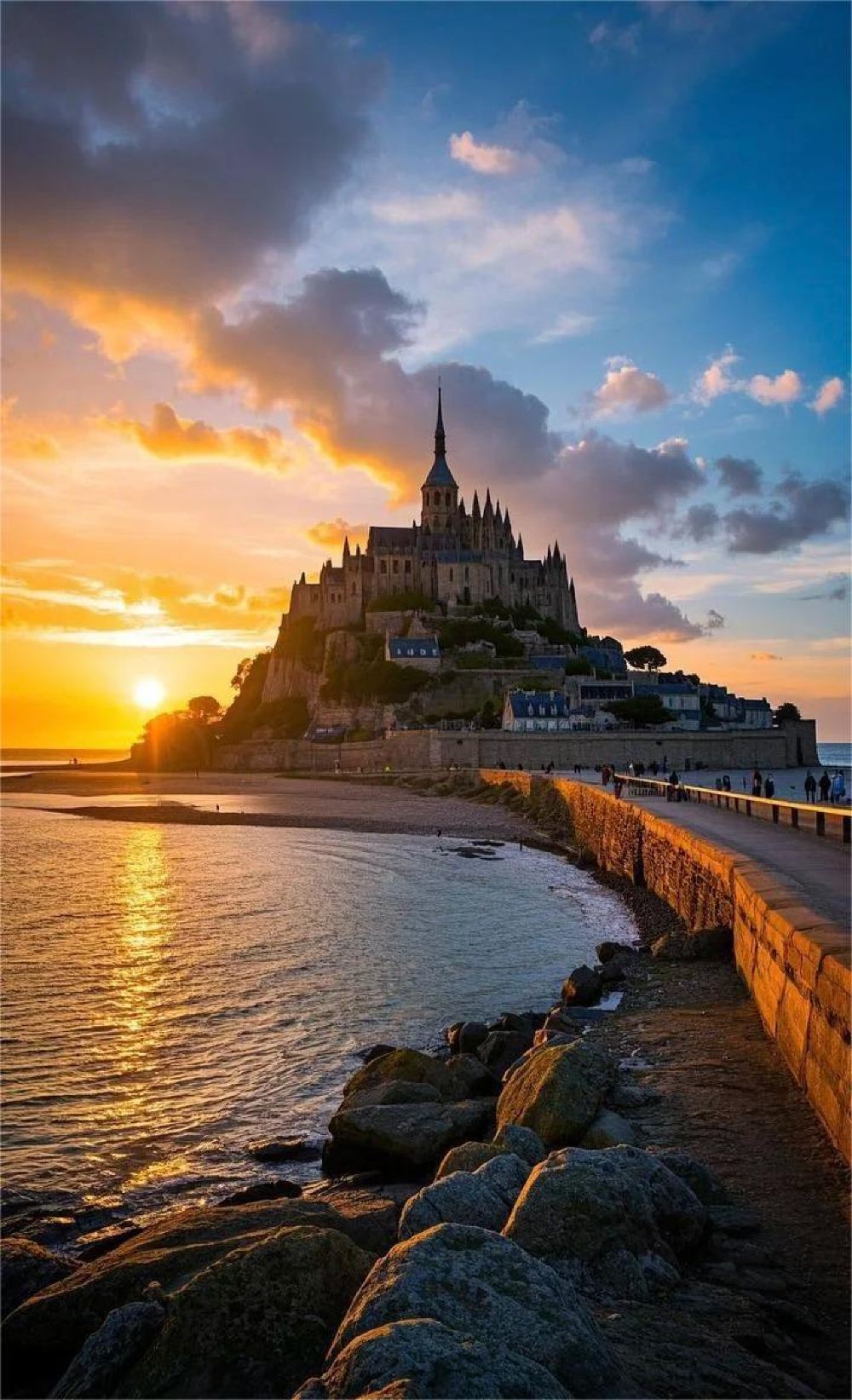 ▲ 圣米歇尔山,在夕阳余晖中宛如梦幻城堡。孤耸海上,尖塔刺破云霞,光影勾勒出神秘轮廓。海水波光粼粼,与天空绚烂相融,尽显法式山海间的雄浑与浪漫。