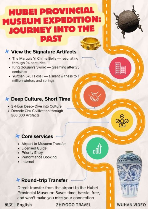 将您的武汉机场转机停留/中转时间变成一次精彩纷呈的5小时探险之旅。每条线路都提供独特的步行体验,带您领略历史、文化、美食或自然风光。您可以选择交通方式:地铁、高铁、出租车、机场直通车或网约车。当地导游的带领将使您的旅程更加便捷和富有启发性。探索黄鹤楼、湖北省博物馆、武汉大学、东湖磨山、汉口建筑或隐秘的当地小巷。加入我们的旅行团,将您短暂的中转停留变成一段充满发现和乐趣的难忘旅程,然后再前往下一个目的地。以下是WAE02 湖北省博物馆5小时游