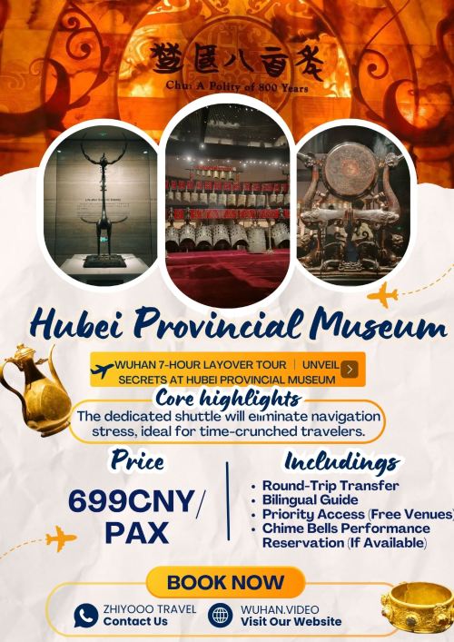 充分利用您在武汉的转机时间,前往湖北省博物馆,体验精心策划的2小时文化之旅。湖北省博物馆是中国最重要的历史博物馆之一。此行程安排紧凑,全程(机场至博物馆往返)耗时不到5小时,是中转游客的理想之选。