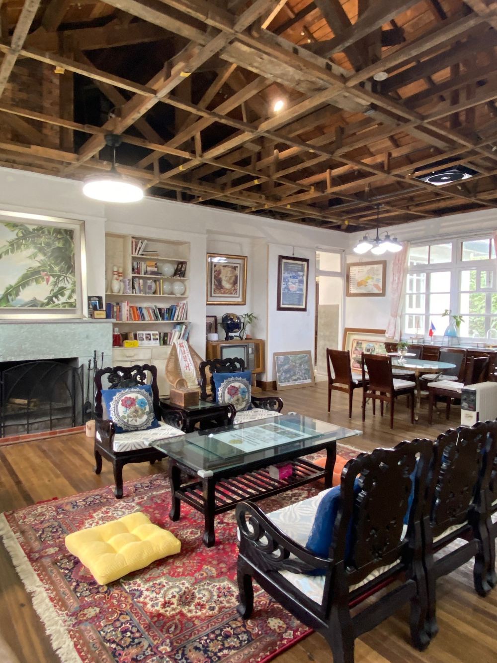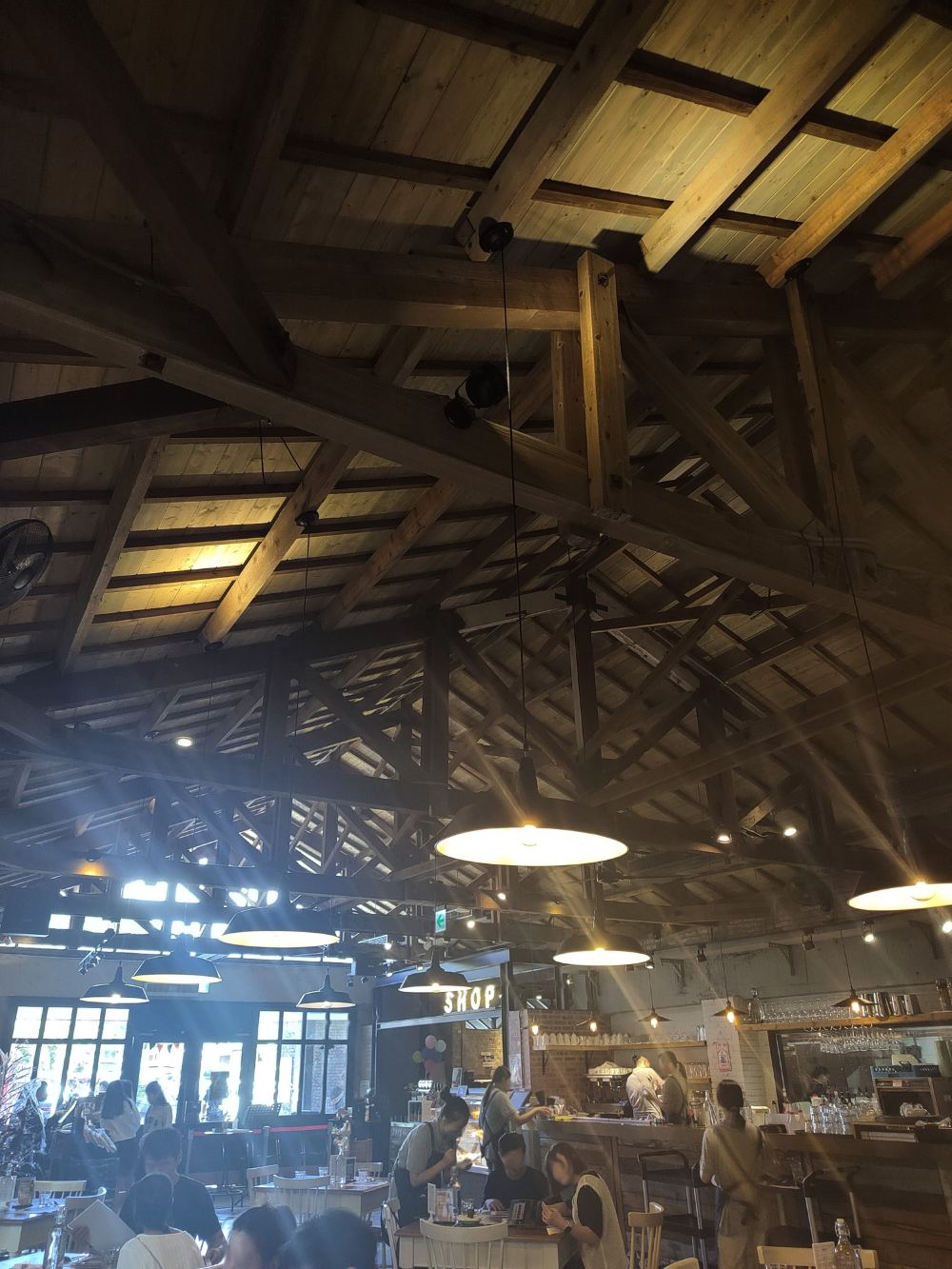 - 进到餐听内,立马可见现存保留高大面积的木造屋顶架构