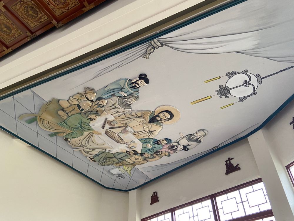 为了需要做礼拜的美军军官与眷属们,在当时天主教不盛行的台湾,搭建了一间非常融入中式建筑的天主教堂,未进门先看到有着中式庙宇的屋顶,还有在天主教堂入口处的一对石狮子,室内的天花板可以看到耶稣有别于西方的穿着,还有身着唐服的圣母玛丽亚,可以看到中西合璧的文化融合。