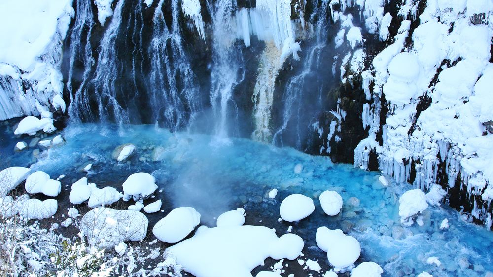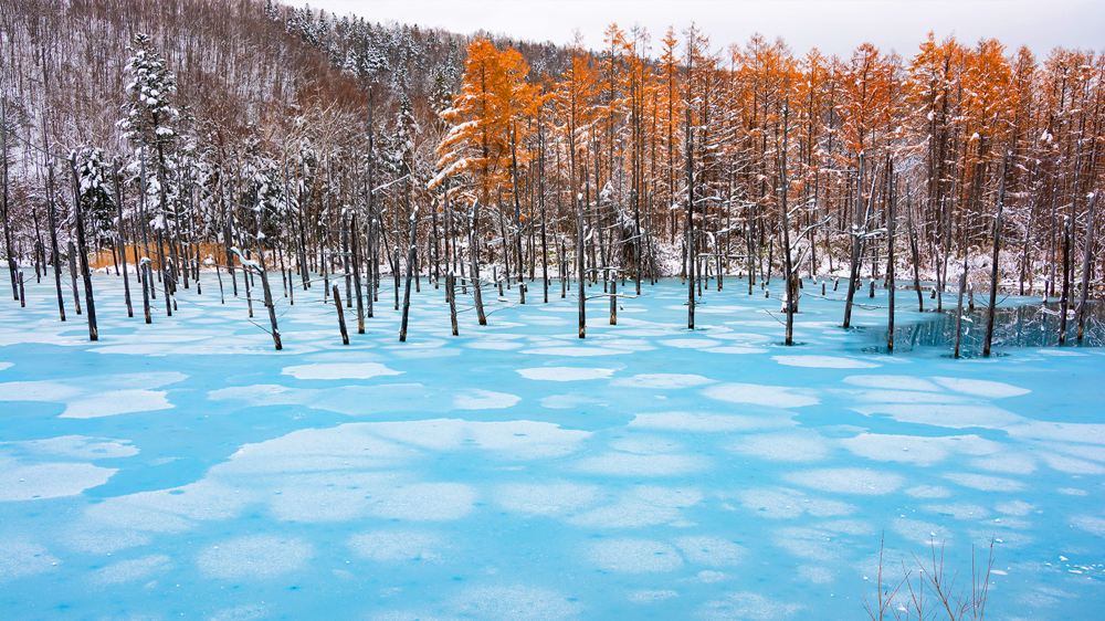 ▲ 冬季青池被白雪覆盖,局部露出的蓝色池水,拍出来对比强烈。