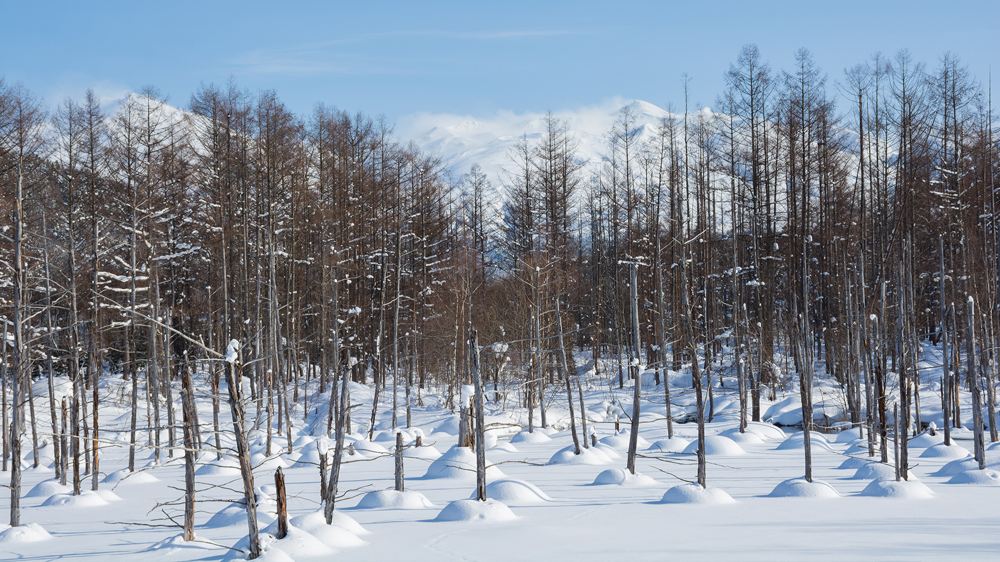 ▲ 白金青池因水中矿物质折射呈现蓝色,沿着木栈道取景能拍到枯木与湖面的独特组合。