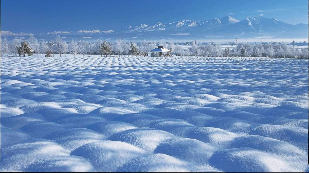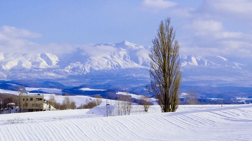 ▲ 四季彩之丘位于美瑛丘陵地带,冬季这里化身为银白世界,雪原延伸至远山,景色开阔。