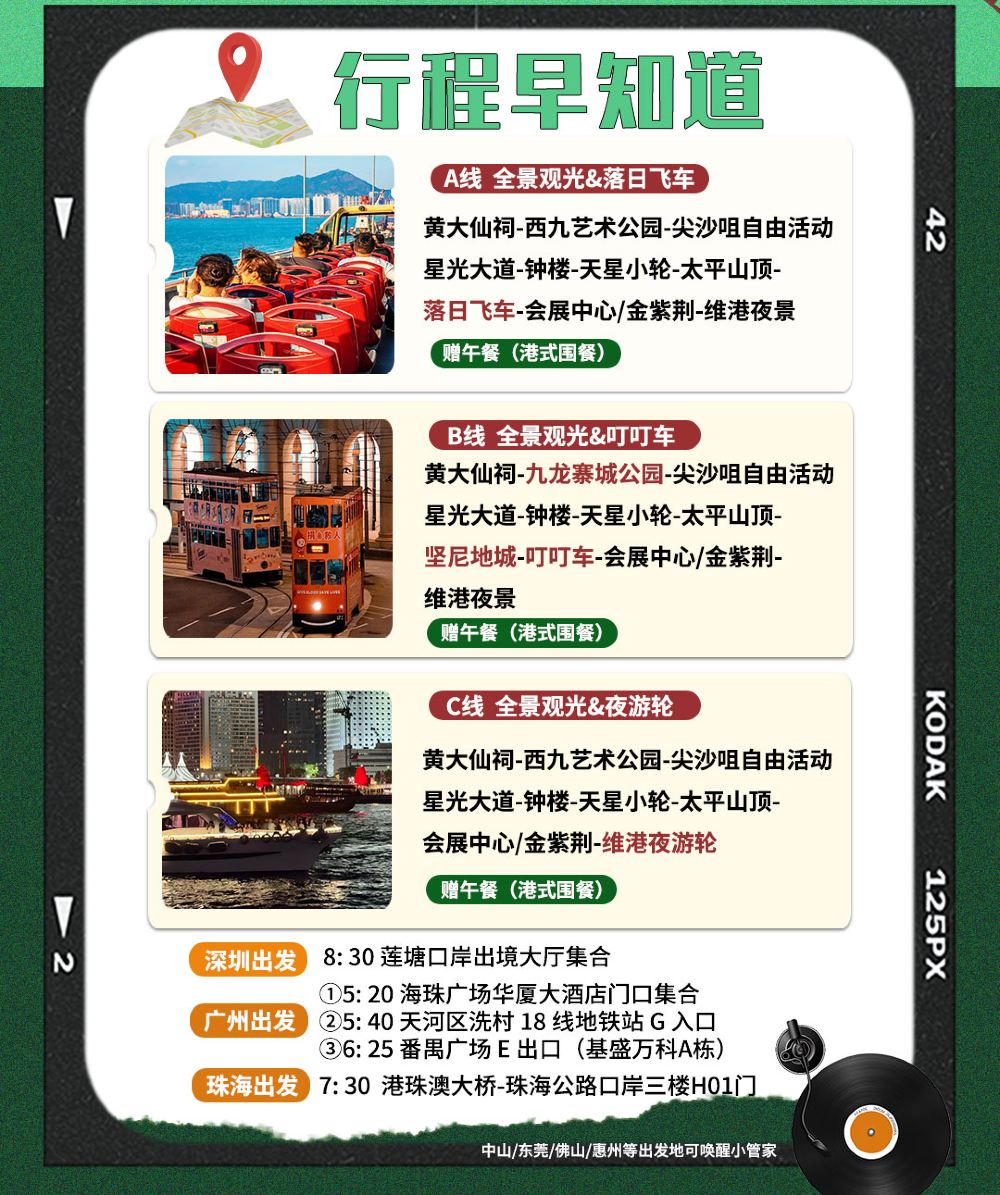 【香港一日游-含落日飞车/叮叮车/维港夜游轮】星光大道+午餐【【三重体验维港】①星光大道赏港岛天际线 ②天星小轮横渡维港 ③太平山顶俯瞰壮阔的港湾】