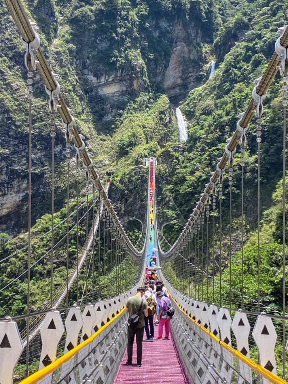 ▲ 七彩吊桥长342公尺、最深110公尺,是全台最长、最深的吊桥。桥面设计采阶梯式共有420阶,名为七彩吊桥,全因桥面以彩虹七色设计,每50公尺就有一种颜色,远远看去就像一道彩虹悬挂在山林间。