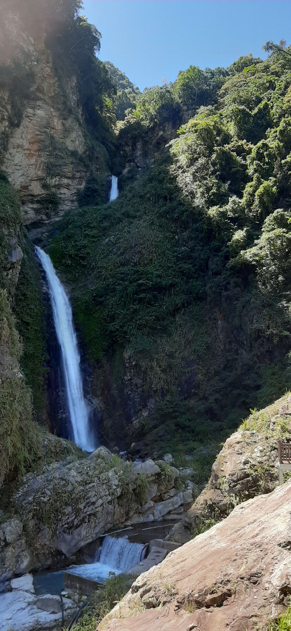 ▲ 双龙瀑布在七彩吊桥的尽头,是浊水溪支流的源头,位处于群山之间的溪流,在陡削山壁上倾泄而下,瀑布落差高约100公尺分为上瀑与下瀑,似两条蛟龙盘旋而得其名,陡峭山壁制造出水烟纷飞、气势万千美景。