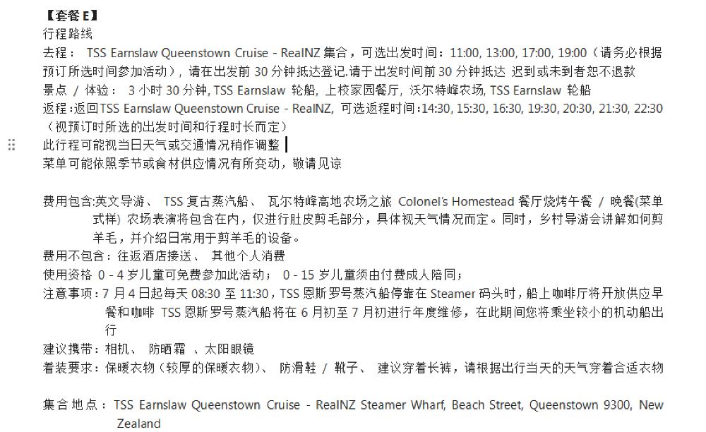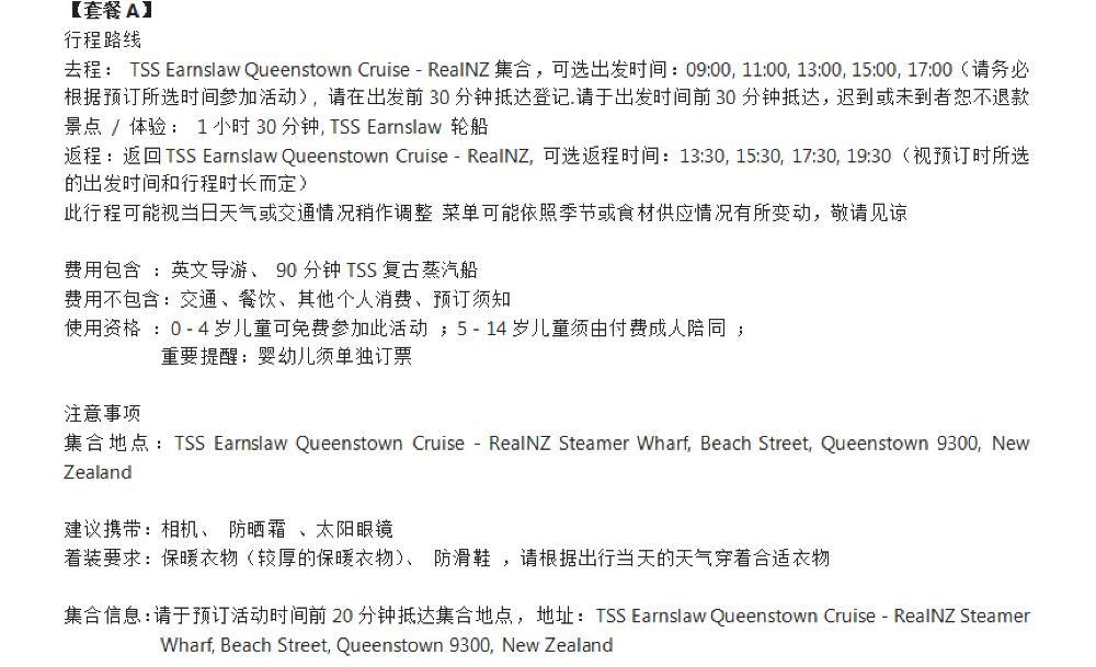 【套餐A】TSS恩斯罗号蒸汽船巡航 拼团(详情咨询客服)可选出发时间:09:00, 11:00, 13:00, 15:00, 17:00(请务必根据预订所选时间参加活动), 请在出发前30分钟抵达登记.请于出发时间前30分钟抵达 迟到或未到者恕不退款; 可选返程时间:13:30, 15:30, 17:30, 19:30(视预订时所选的出发时间和行程时长而定)