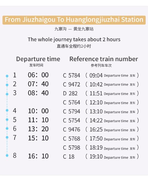 - 前往黄龙九寨高铁站的旅程大约需要2小时。具体行驶时间将根据实际情况而定。