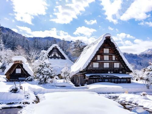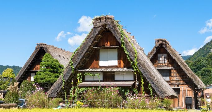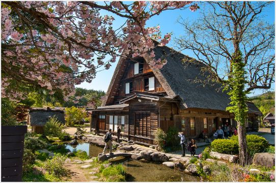 ▲ 白川乡位于岐阜县西北部白山山麓,是四面环山、水田纵横、河川流经的安静山村。那里“合掌造”(茅草的人字形木屋顶)式的民宅,110 多栋连成一片,1995 年被指定为联合国教科文组织的世界文化遗产。在野外博物馆的“合掌造民家园”里,将 25 栋在白川乡各地使用过的“合掌造”房屋移建、保存在这里。园内还按古代农村的模样,建有寺庙、水车小屋、烧炭小屋、马厩等建筑。其中有染色、机织等传统工艺的表演,游人在这里还能亲自体验一下。