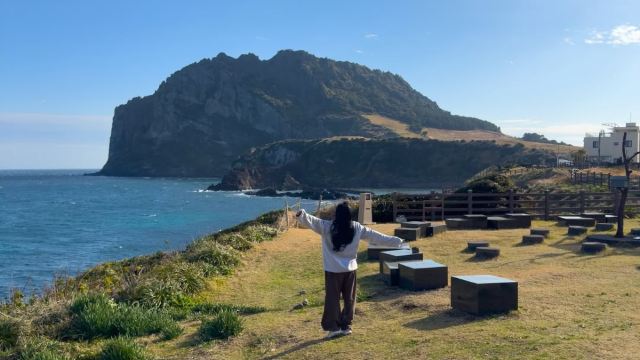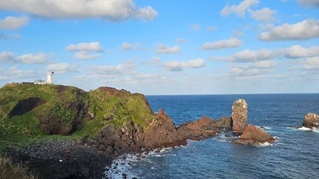 涉地可支坐落于济州岛东部西归浦市城山邑,与城山日出峰隔海相望,是向大海延伸的火山岩岬角。海岸由红泥与黑火山岩构成,悬崖上是开阔草地,立有白色灯塔,四月油菜花海映着碧海,浪漫别致。这里是韩剧取景地,也是偶来徒步路线节点,免费全天开放,日出日落景致尤为动人。