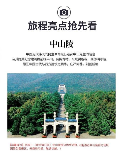 【关于门票】:60周岁-69周岁以及全日制大中小学生(不含成人教育、研究生)携带有效学生证证件,符合半票退规则,退门票差价45元,导游联系时需告知导游,出行时退。如您携带护照、港澳通行证、台胞证等非身份证证件出行,需要导游协助现场使用二维码或现场换票进入中山陵等景区,因此可能会耽误一些时间,敬请谅解!