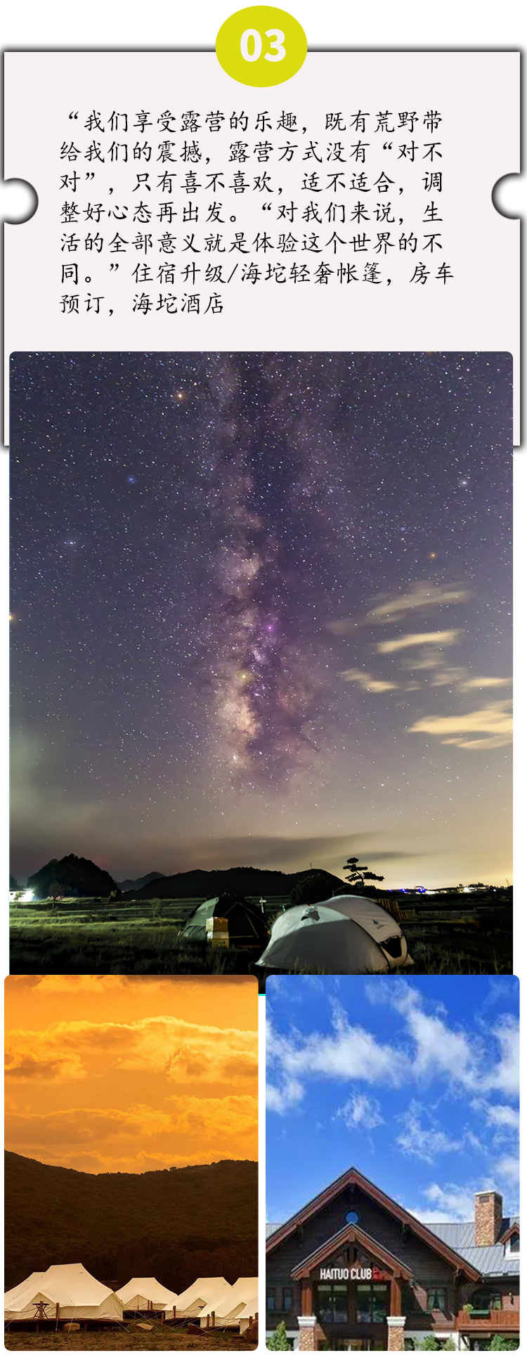* 2-4人轻奢帐篷600-1200元/顶,2-6人酒店1000-1500元/间,4人房车1380元/车(数量有限,预订前请咨询客服);本活动属于半自助游户外活动,领队安排行程无景点讲解,费用包含以外的自主费用自理。轻奢帐篷图示