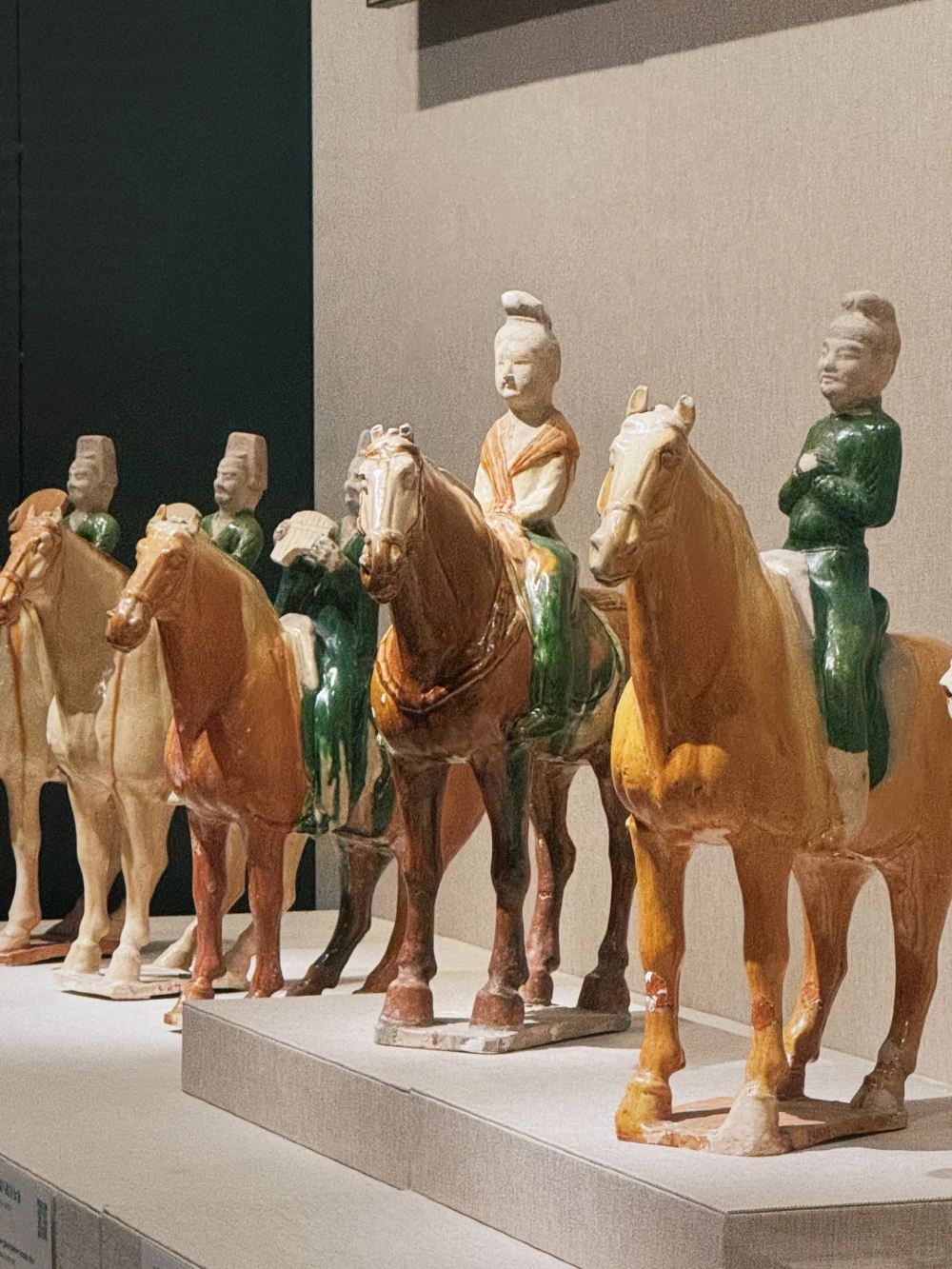 ▲ 这些骑马俑生动展现了唐代的社会风貌,马匹造型矫健,人物神态各异,有的可能是官吏、侍从或乐俑,反映了当时的出行仪仗、社会等级以及陶瓷工艺的高超水平,是研究唐代服饰、雕塑、丧葬制度等的重要实物资料,具有极高的艺术价值和历史价值。