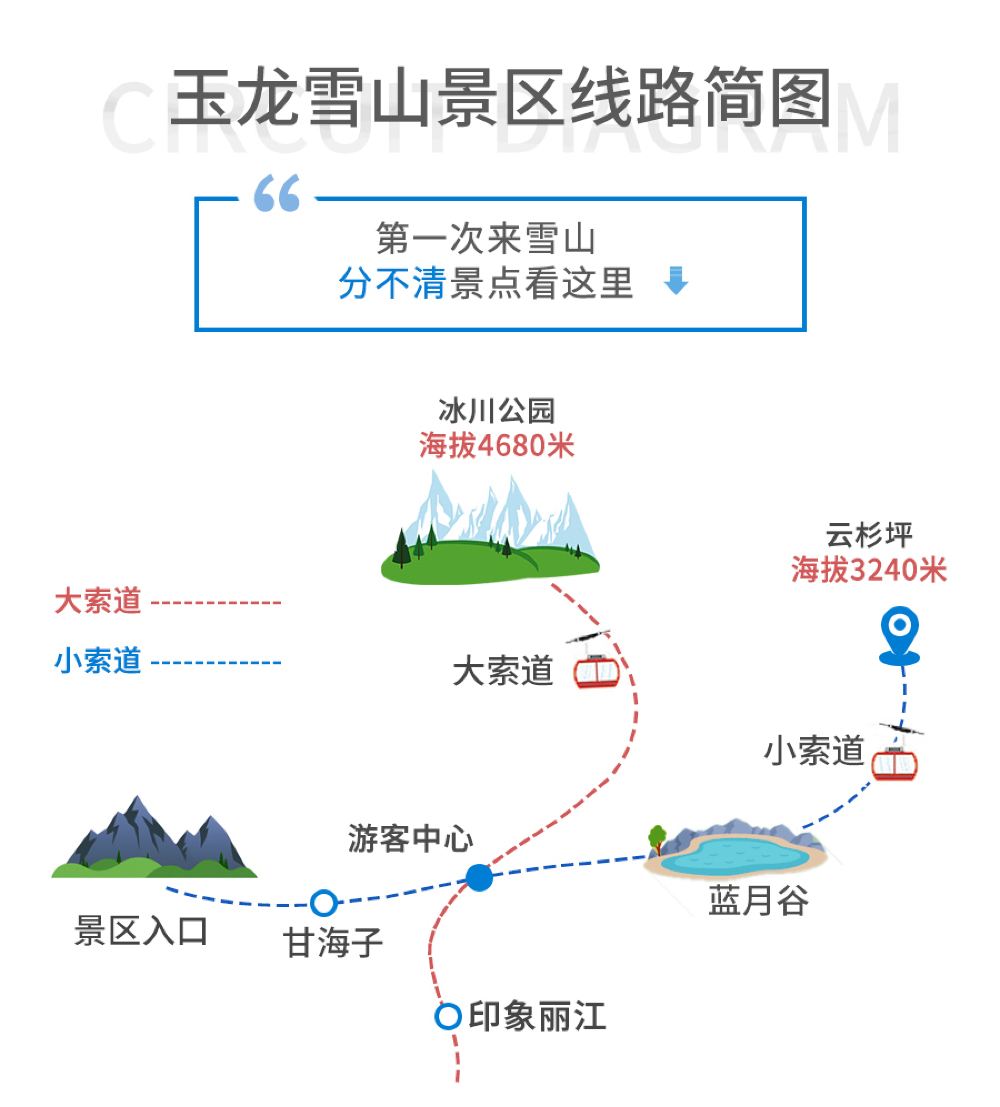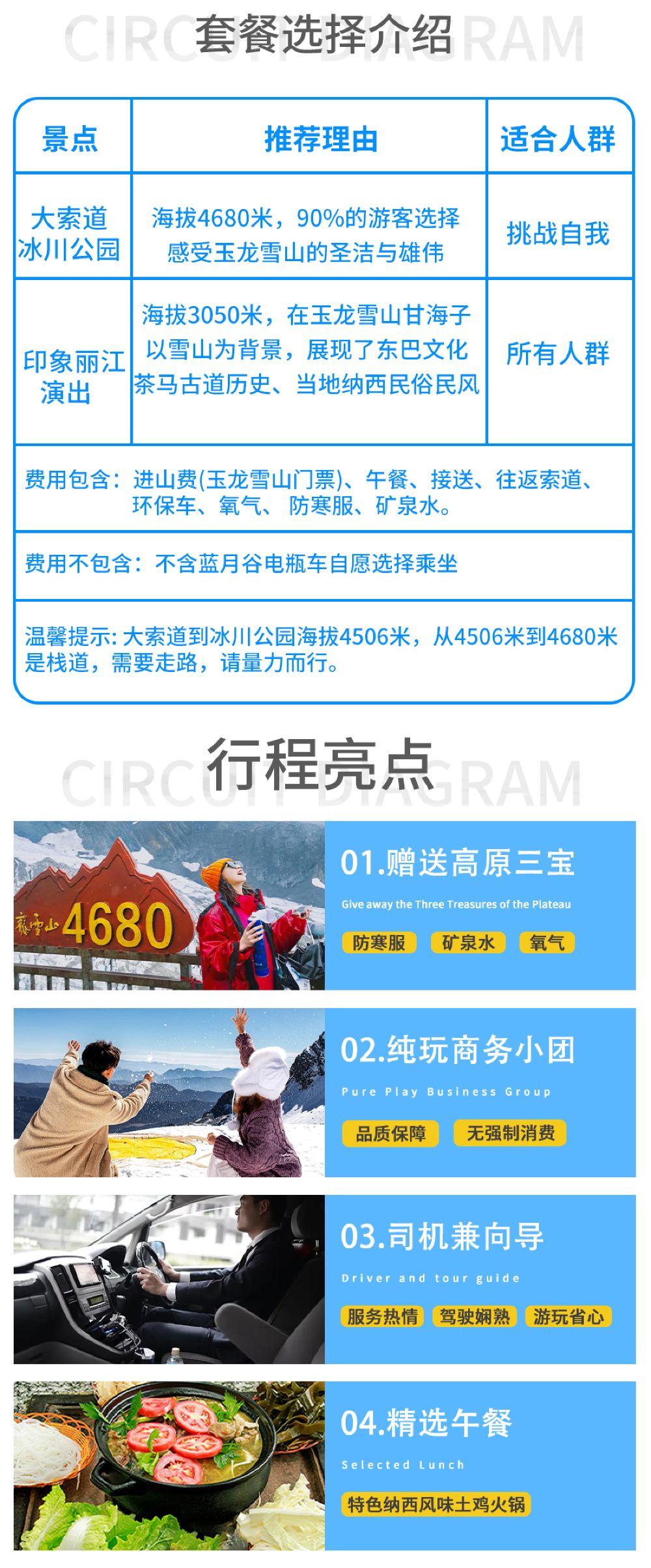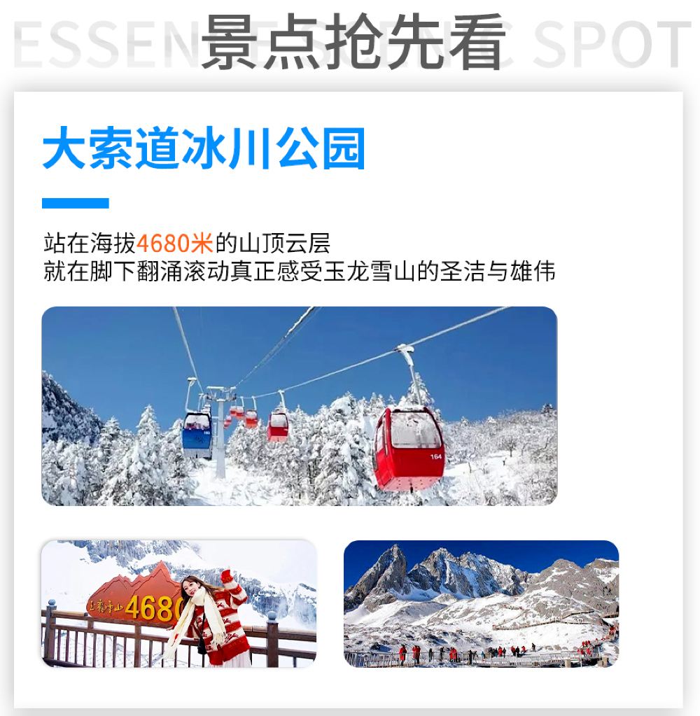 【关于优惠证件】本线路价格已经是旅行社优惠价,应景区要求,大索道套餐需制卡大玉龙套票,除现役军人外,任何证件如学生证、60岁以上老人、1米2以上儿童等人群均不再享受景区门票减免。不再减免,还望谅解!