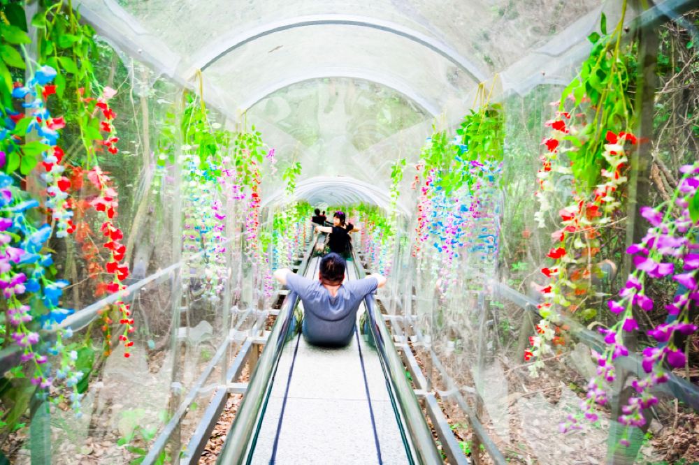 高空旱滑道依山势而建,全长318米,宽1.1米。落差88米,蜿蜒起伏,与周围绿树、青山融为一体,宛如长龙游走于山林间。
