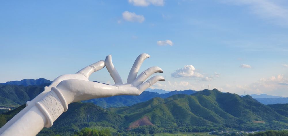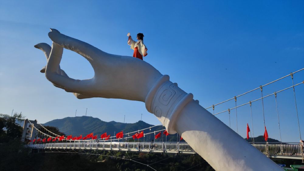 眼前这只矗立于悬崖之上的巨手名为“大地之手”。大地之手距离谷底186米,站在巨手掌心俯瞰万壑绵延,山林光景尽收眼底。