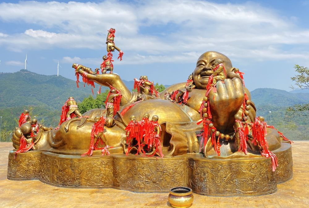 整座佛像长达6.5米,高2.8米,宽4米,由巨型铸铜打造。底座为雕花设计,只见斜倚而卧和弥勒左手紧握佛珠,笑容可掬,双耳垂肩。在弥勒硕在的身体上,塑有整整30个正在嬉戏耍闹的小顽童,各个形神各异,栩栩如生。