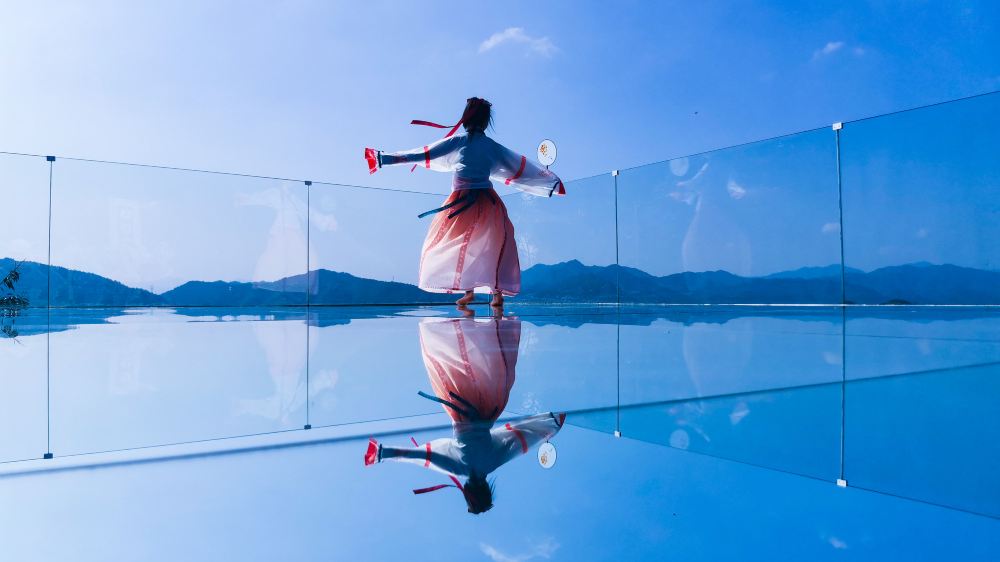 天空之镜由若干个硕大的镜面拼接而成,将蔚蓝的天空、峻美的山峰、静溢的古寺糅合在一起。