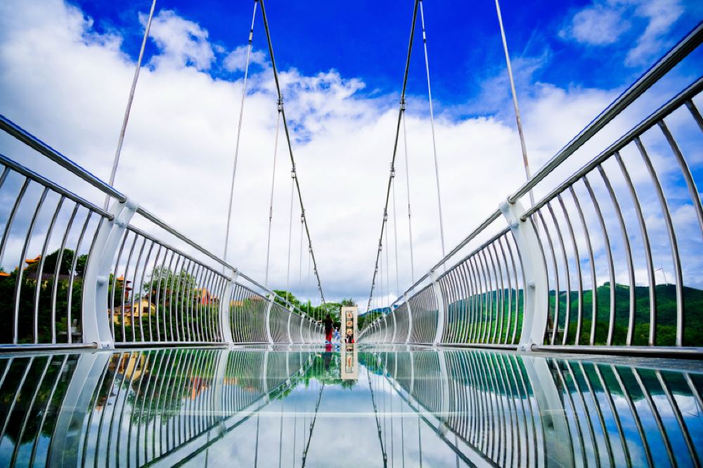横跨天龙山主峰和阿婆髻山峰,玻璃桥全长139米、