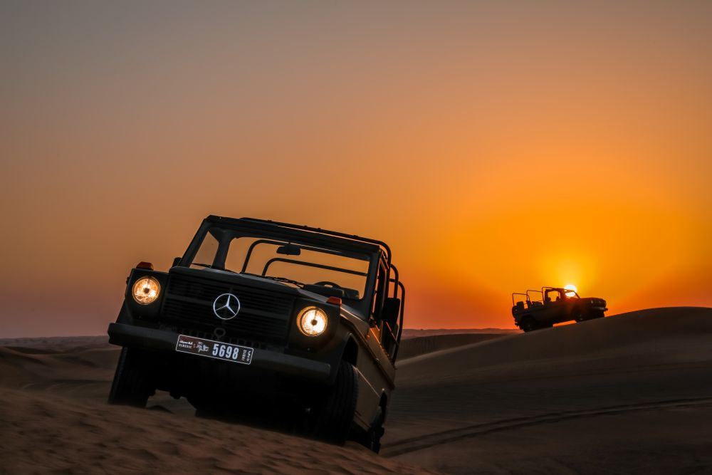 ▲ 驾驶复古G级奔驰在沙漠中追逐日落,感受无与伦比的刺激体验。金色夕阳为这段难忘的越野之旅勾勒出**背景。