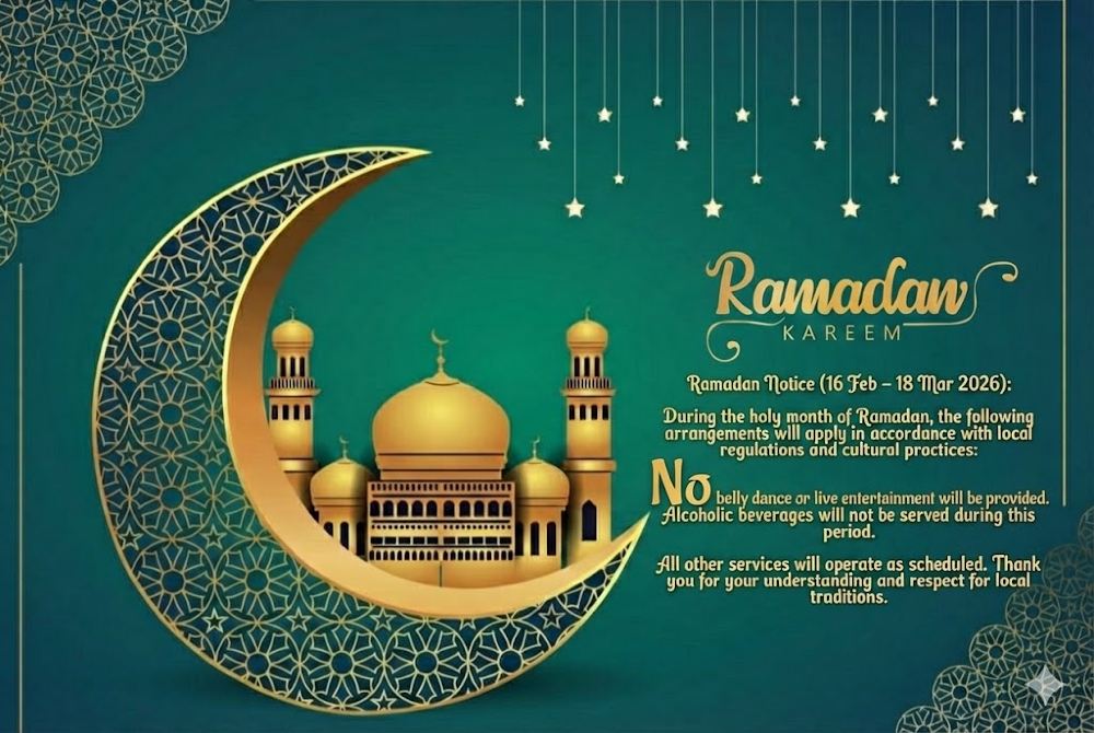 ▲ 斋月注意事项(2026年2月16日-3月18日): 根据当地法规和文化习俗,神圣斋月期间将实行以下安排: • 不提供肚皮舞及现场娱乐表演 • 期间暂停酒精饮品供应 其他所有服务将照常运营。感谢您对当地传统的理解与尊重。