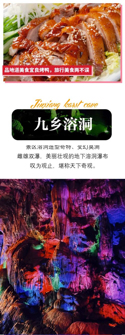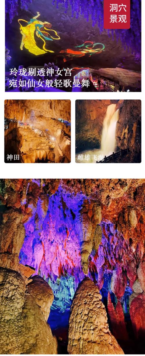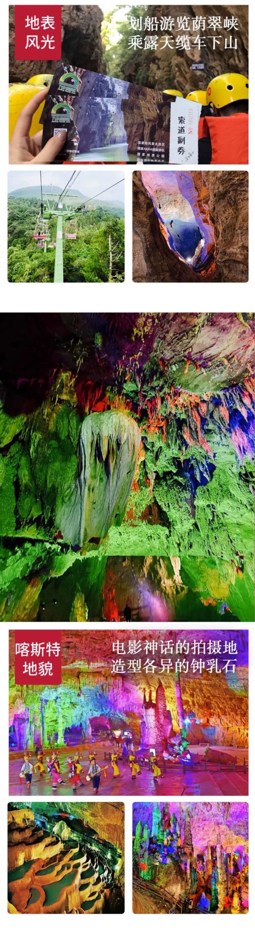 乘观光电梯、游览荫翠峡、惊魂峡、雄狮大厅、仙人洞、雌雄瀑、神田、彝家寨、地下倒石林、九乡旅游索道。