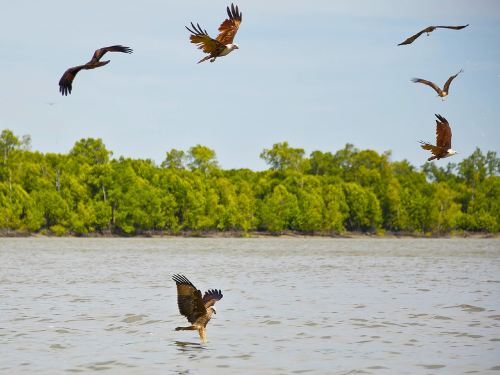▲ ▲ 出海观赏老鹰捕食是当地游客喜欢的的生态活动之一。乘船驶入红树林河口,游客能看到数量众多的红树林鹰与白腹海雕在天空中盘旋、盘旋俯冲,场面壮观而震撼。