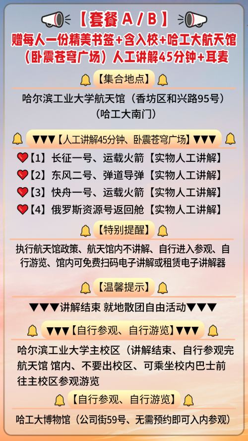 哈尔滨工业大学航天馆【人工讲解+门票预约+耳麦】A/B赠书签【套餐 A / B 赠每人一份精美书签+预约入校+航天馆人工讲解45分钟、5周岁含 5周岁以上大小同价】