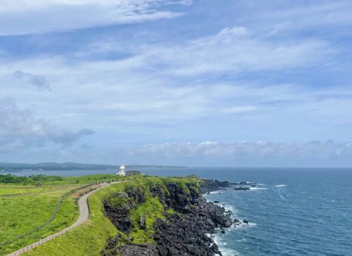 ▲ 在济州岛西端连接的新昌风车海岸道路上有海上风力园区,因此可以看到沿着海岸道路排列的风车。沿着蜿蜒的海岸线看到的白色风车和翡翠色大海给我们展现了凉爽的秋景。蔚蓝的海面上展示着各种各样的看点。特别是,新昌海岸公路作为美丽的日落公路,是首屈一指的地方,因此拍摄照片,欣赏日落也很好。