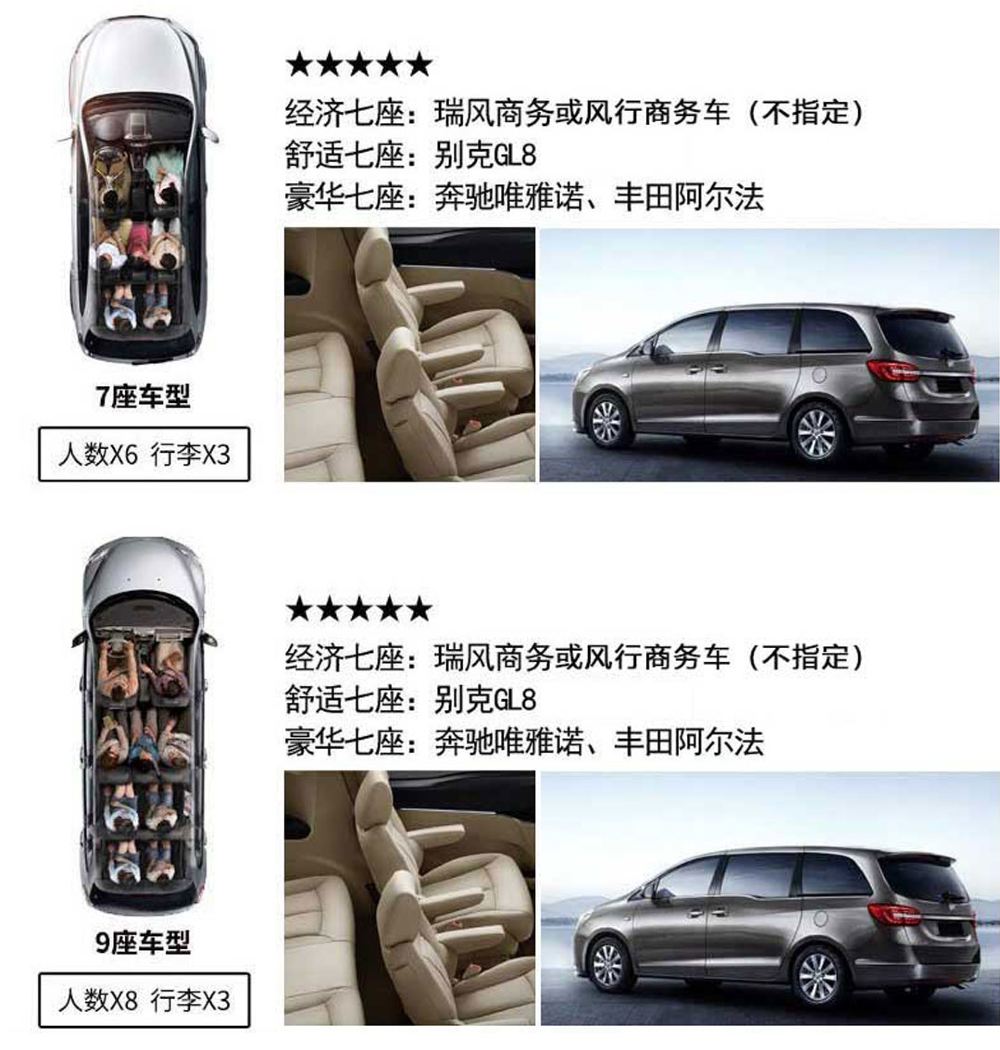 1、请根据实际人数或行李数选择对应车型,如出行当天发现人数与携带行李不符,司机有权利拒绝发车(也可协商补差价更换车型)。