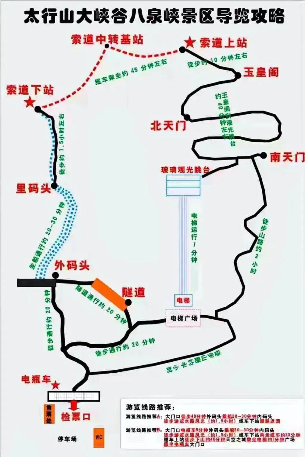 园区门口——乘电瓶车——时光隧道——高峡平湖游船——峡谷水路景观——亚洲3000米拐弯索道(下站——中站——上站)——观景步道(十二生肖峰汇、八泉峡奇峰林)——3层玻璃观景眺台天空之城——3项吉尼斯世界纪录52秒208米百丈崖电梯——电瓶车——园区门口。