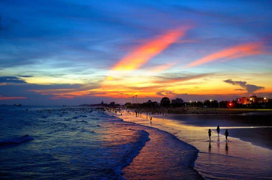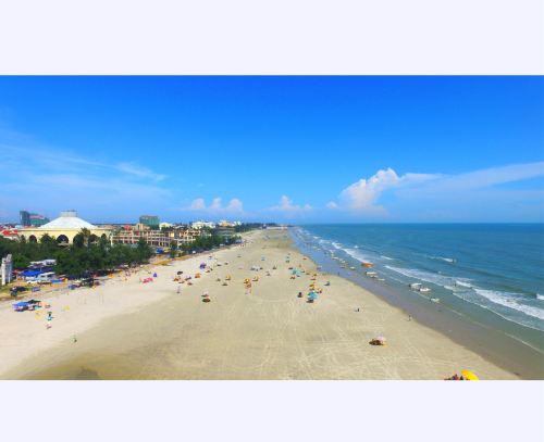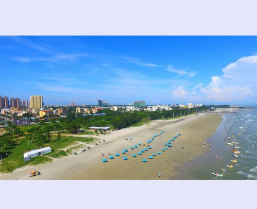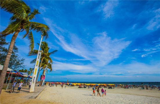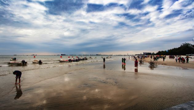 ▲ 北海海滩公园是银滩国家旅游度假区的重要组成部分。公园内海滩浴场长1500米,台湾草坪10万平方米,占地面积300多亩。公园内有亚洲第一大的激光音乐喷泉,世界第一的九龙玉船,银滩的海水浴场,巨型不锈钢雕塑《潮》。