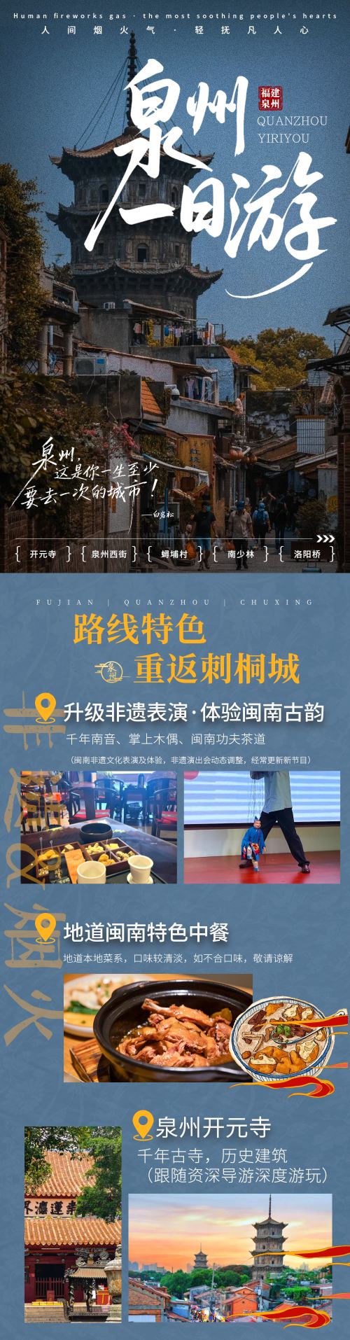 【行程安排】洛阳桥——南少林——赠送午餐——非遗表演——蟳埔村——开元寺——泉州西街