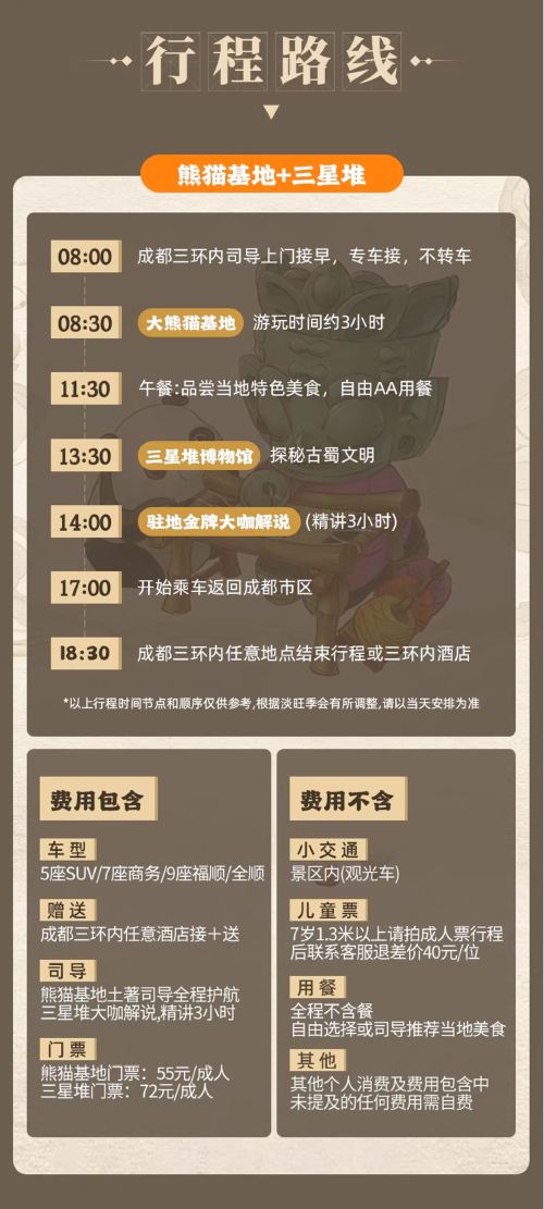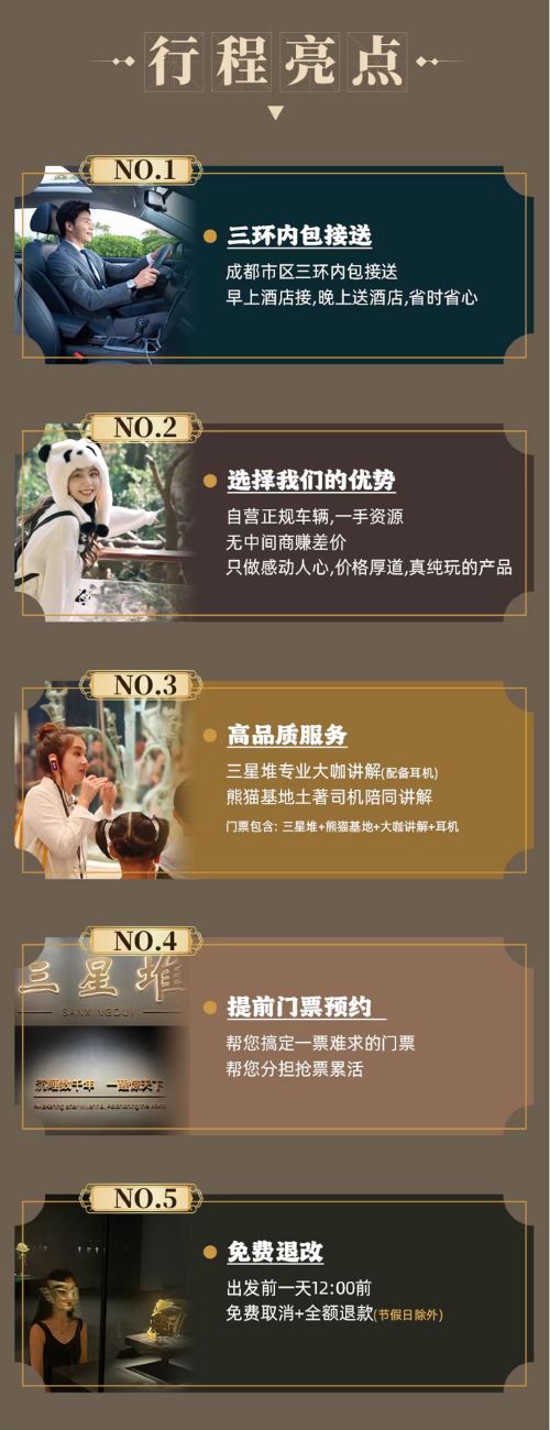 提供成都三环内司导上门接送服务,早上司导会直接到酒店接,晚上结束后再送回酒店,全程不用转车,小团出行更自由、更轻松!不像大团要等一堆人,很多大团打着 “免费接早” 的旗号,其实是让您自己中转去集合点再出发,集合点还有人推销,晚上还得自己回酒店,请仔细甄别对比!