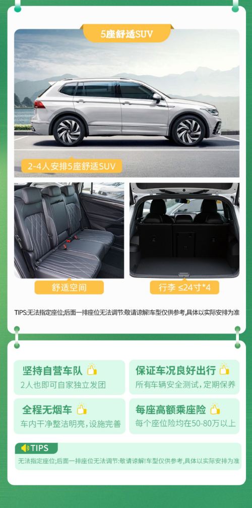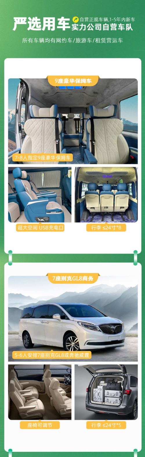 7-8人指定安排9座福特新全顺或福特全顺或9座福顺,5-6人指定7座安排别克GL8或7座奔驰威霆商务车,2-4人指定安排5座SUV或B级轿车,免费提供儿童座椅,可放行李,保证一人一正座,不指定车型,具体车型根据当天出行人数安排,拼团行程无法提前预留座位,如有特殊需求提前与客服沟通,敬请谅解!
