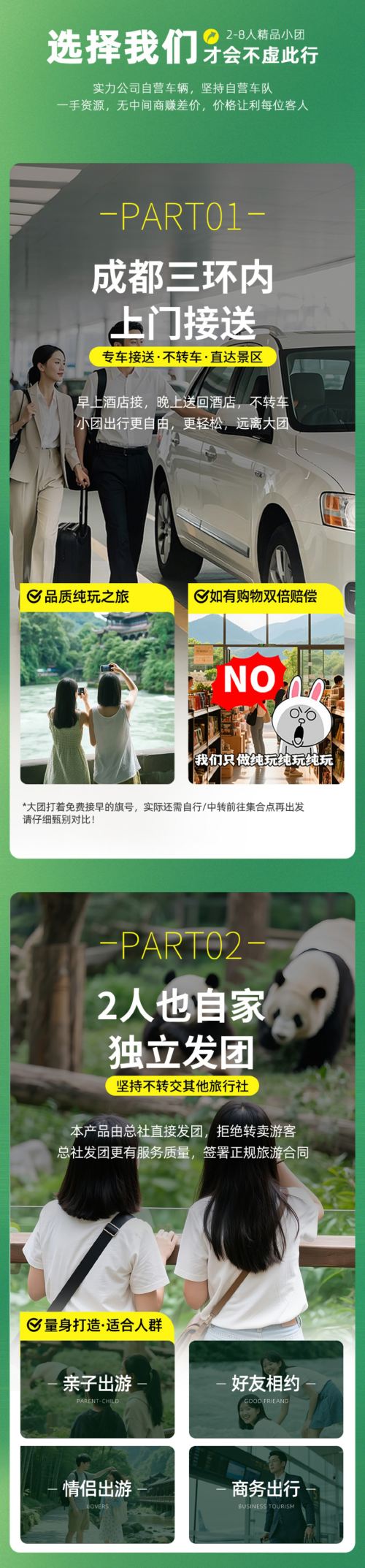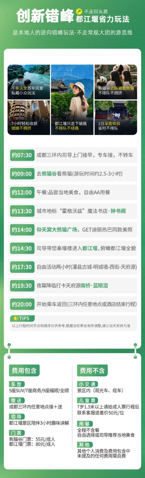 提供成都三环内司导上门接送服务,早上司导会直接到酒店接,晚上结束后再送回酒店,全程专车,不用转车,小团出行更自由、更轻松!不像大团要等一堆人,很多大团打着 “免费接早” 的旗号,其实是让您自己中转去集合点再出发,集合点还有人推销,晚上还得自己回酒店,特别折腾!请仔细甄别对比!