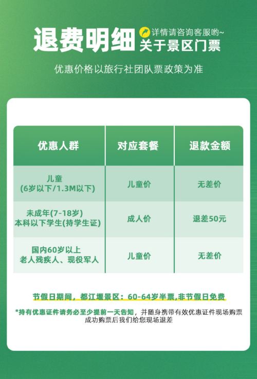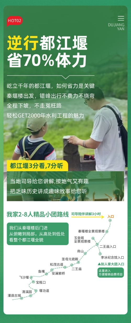 约14:30:我们特地推出司导带您从都江堰景区秦堰楼进入,俯瞰都江堰景区全貌,不走回头路,全程下坡路为主,老人小朋友轻松游览,步行轻松;秦堰楼进为您节省40元扶梯费,市场大巴团90%都是从都江堰景区玉垒阁进,自费扶梯费40元/人,大团是必须,请仔细甄别对比!