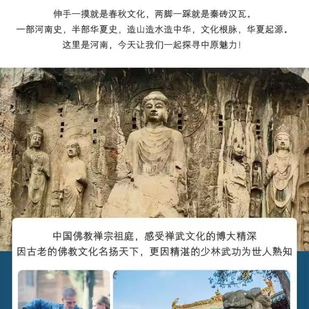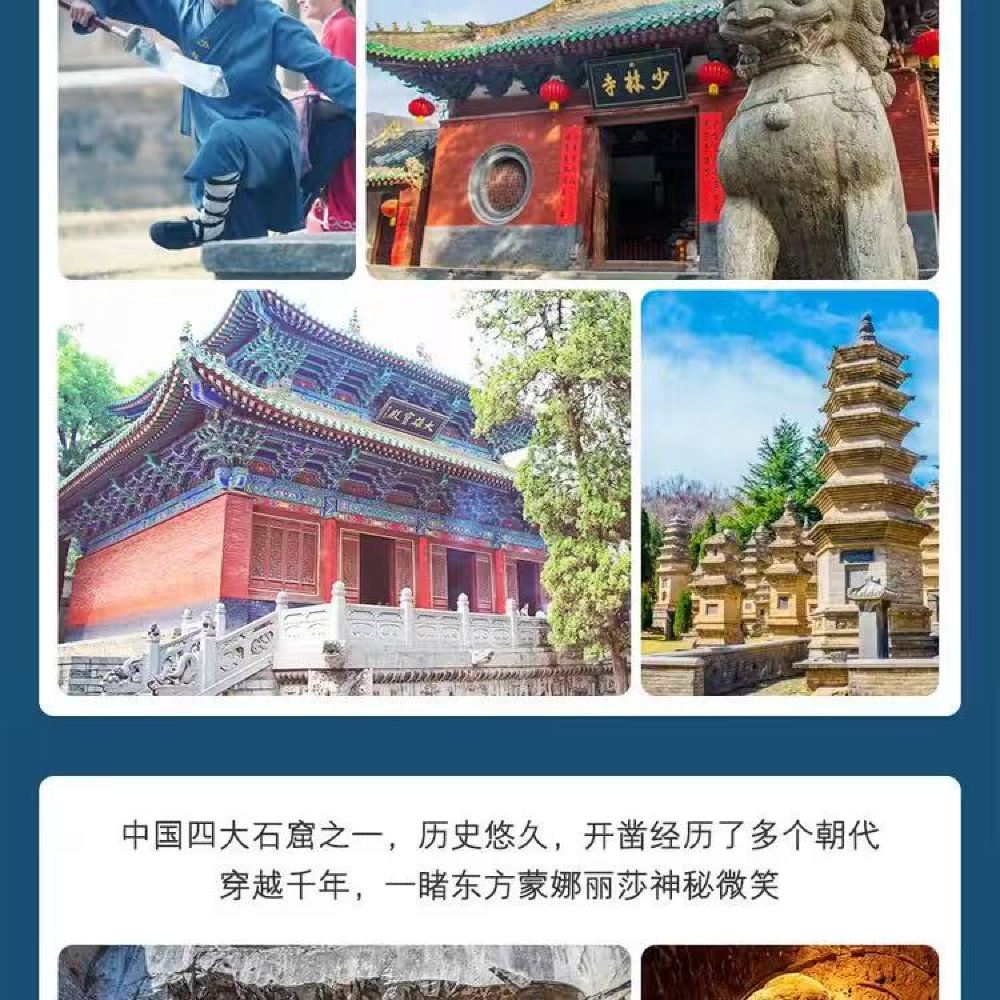 ▲ 龙门石窟与少林寺一日游|石刻艺术与禅武文化的深度体验 一日行程,畅游两大世界文化遗产。从龙门石窟的精湛石刻,到少林寺的禅武传承,带您领略中原地区独具特色的文化魅力。