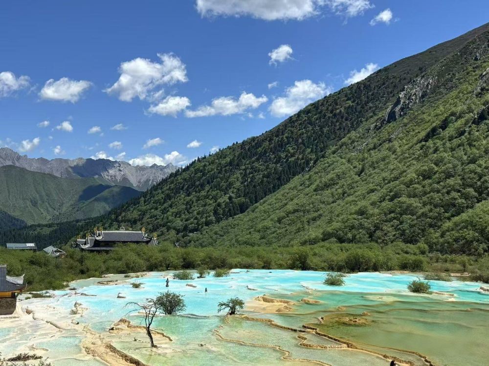▲ 这里拥有世界罕见的钙化景观,金沙铺地的奇景与五彩池群交织,宛如仙境画卷。