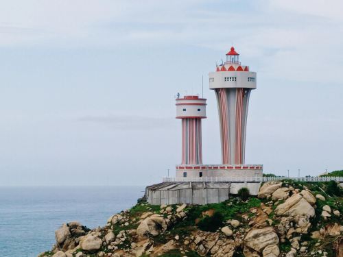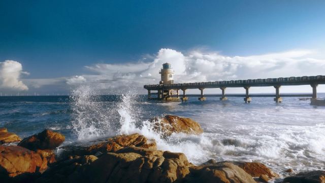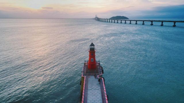 ▲ 灯塔塔身呈鲜艳的红色,顶部为黑色,与碧海蓝天以及蜿蜒的南澳大桥形成鲜明对比