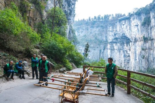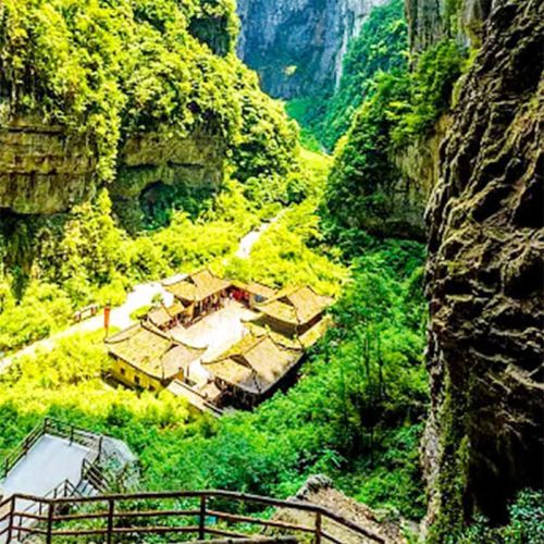 ▲ 武隆天生三桥风景区以天龙桥、青龙桥、黑龙桥三座天然的石拱桥被外界所知,天生桥群。具有雄、奇、险、秀、幽、绝等特点,经历了上千万年的风风雨雨。 在天生三桥的天龙桥的坑底院有一座座青瓦灰墙的古色古香天福官驿”,始建于唐武德二年(619年),地处“钻天铺”和“白果铺”间之要津,是古代涪州和黔州官方信息传递的重要驿馆,后毁于兵燹。该建筑位于武隆天坑,天生三桥的青龙桥下端,坑底有条谷底大道,宽约5米,仿如古时驿道,可通行木制车,骑马。房屋位于道旁,屋顶被天龙桥所笼罩。