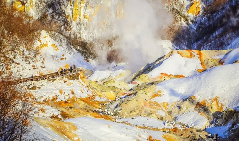 ▲ 登别地狱谷, 探访北海道独特的的地热奇景。漫步全长600米的木栈道,直径450米的火山口遗迹喷涌硫磺蒸汽,空气中弥漫着独特的矿物质气息,仿佛踏入“地狱之门”,气势磅礴又充满神秘感